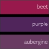 Description: three colour samples: beet, purple, and aubergine. Tidily labelled.